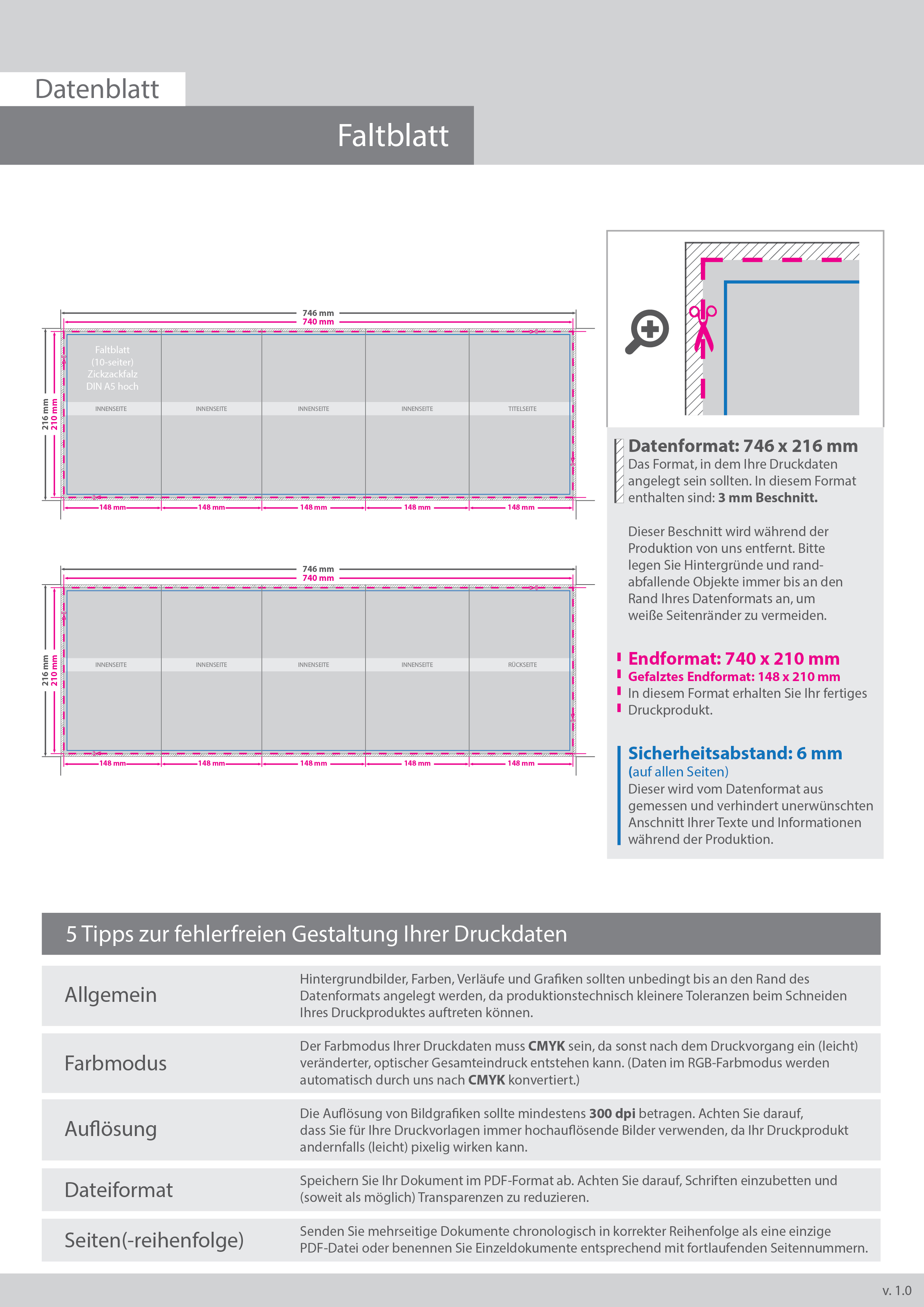 Faltblatt, gefalzt auf DIN A5, vertikaler Zickzackfalz, 10-seitig