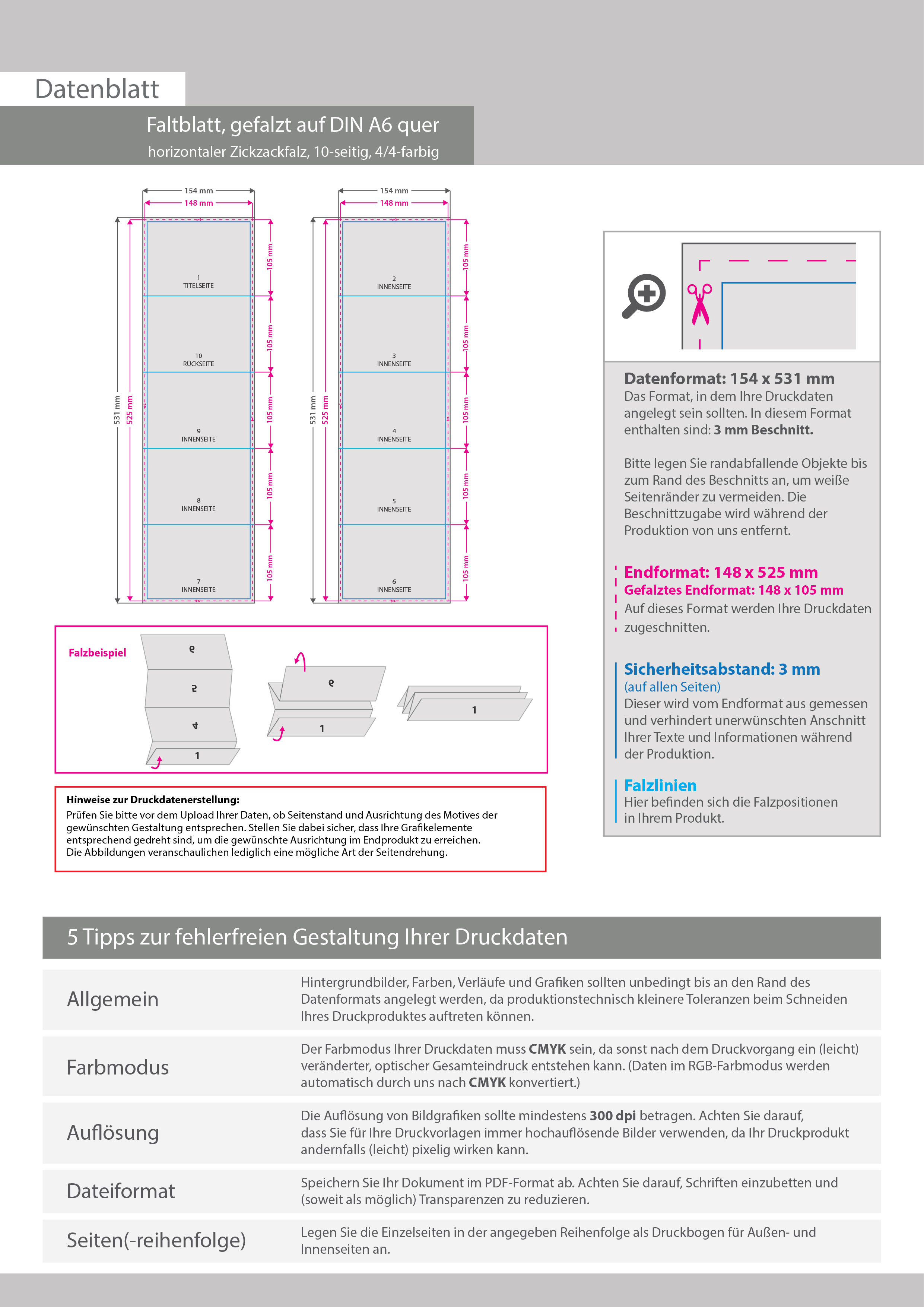 Faltblatt, gefalzt auf DIN A6 quer, horizontaler Zickzackfalz, 10-seitig