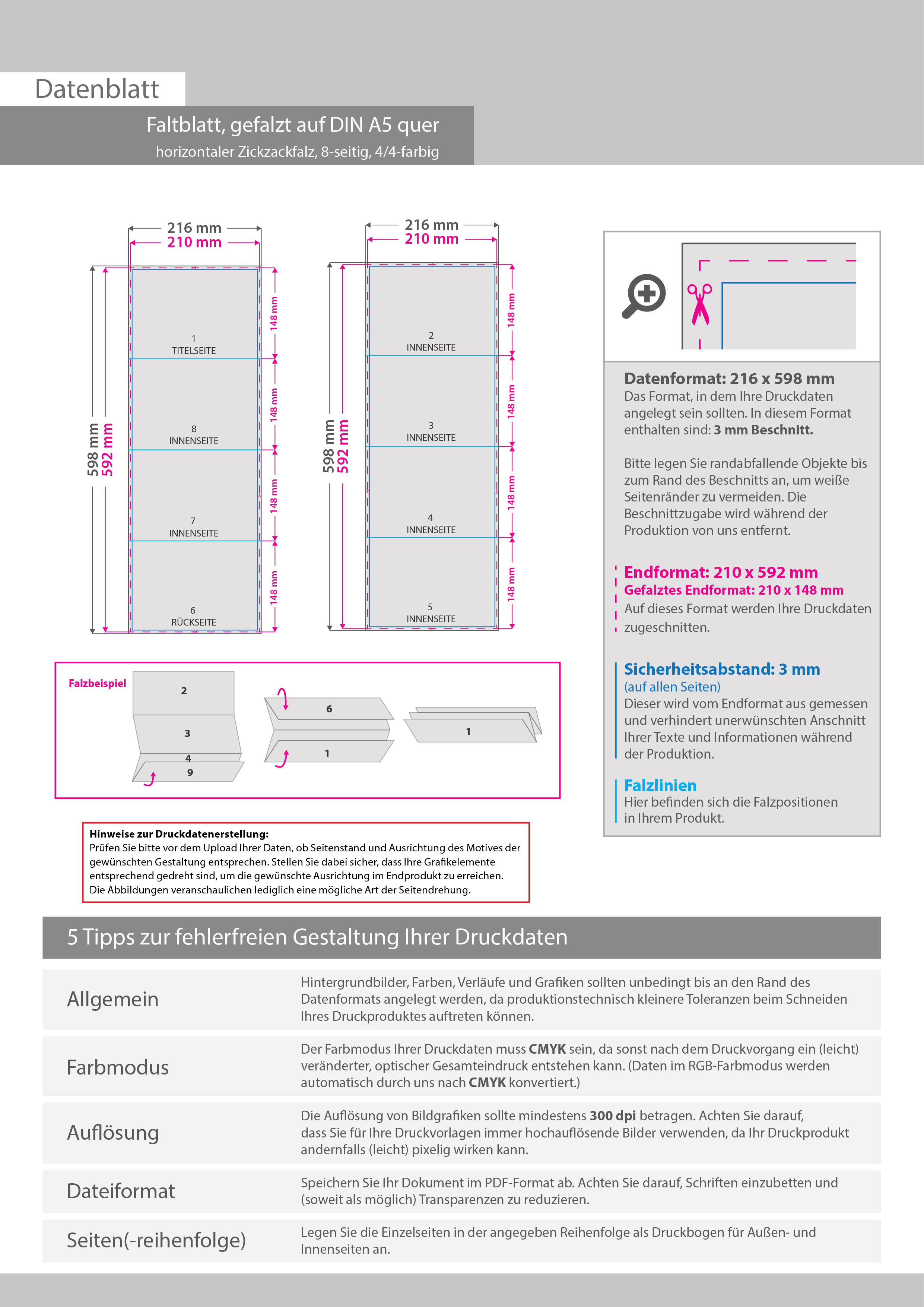 Faltblatt, gefalzt auf DIN A5 quer, horizontaler Zickzackfalz, 8-seitig